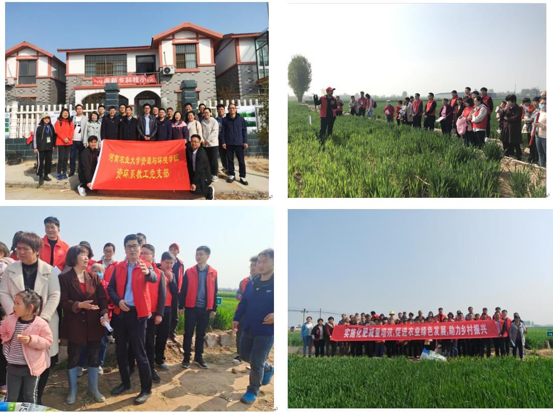 上午,教工党员首先来到河南农业大学新乡科技小院,与驻院研究生和帮扶农户进行沟通座谈,了解研究生学习生活状况及所开展科技助农活动,帮扶解决农户目前作物种植遇到的问题和困难。在小院驻地,支部书记刘红恩教授对周边农户小麦、大蒜和蔬菜种植中遇到的施肥技术和土壤障碍等问题进行了现场答疑解惑。在小麦田间现场,叶优良教授对当地种植大户进行了小麦绿色科学施肥和“一喷三防”技术培训。幽默的语言和通俗易懂的讲解赢得了大家的阵阵掌声。“爱农大”、“新型农民”、“减肥增效”、“粮食高产”是培训现场农户不时大声高喊的词语。