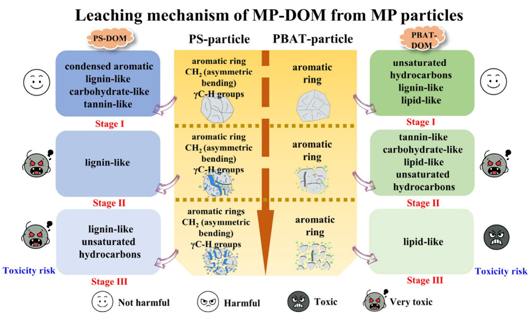 该研究首次提出了微塑料来源DOM的分阶段释放与分子转化机制,并评估了其环境持久性和毒性风险,为理解微塑料长期生态影响及水环境治理策略提供基础数据和科学支撑。