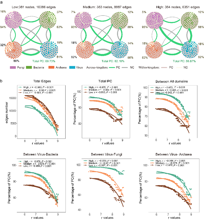 该研究通过宏基因组和病毒组学分析等技术,系统调查了不同盐碱胁迫梯度下玉米等作物根际土壤病毒、细菌等微生物的群落多样性、分布模式及互作关系,重点解析了病毒在微生物网络中的作用及生活史策略转换规律。研究发现,高盐胁迫下,古菌和病毒多样性显著增加,真菌峰值出现在中度胁迫处理。病毒多样性对胁迫强度更敏感,而古菌和真菌多样性则主要受植物类型影响。植物生物量与真菌、细菌多样性负相关,与古菌多样性正相关。土壤pH和Na⁺含量与病毒多样性正相关,而植物Na⁺含量则与病毒多样性负相关。碱化度(ESP)与细菌多样性呈负相关。网络分析表明,随着胁迫程度增加,网络总体正相关比例增加。在高盐碱胁迫下,根际多营养级网络整体及跨域正相关比例在检测r值范围内均最高。胁迫加剧导致域内正相关比例显著下降(主要由病毒互作变化驱动),而真菌域内正相关比例随胁迫增强。与此同时,跨域正相关比例随胁迫程度呈现持续增加,表明盐碱胁迫引发了微生物互作的系统性重构:域内合作普遍减弱(尤其在病毒群落中),而跨域协同增强。此外,本研究还进一步比对了不同胁迫程度下真菌、细菌、古菌和病毒群落组成上的变化,并通过普氏分析发现病毒群落预测的细菌和古菌宿主与扩增子测序实际测得的细菌和古菌宿主群落变化在响应胁迫方面具有显著的一致性。